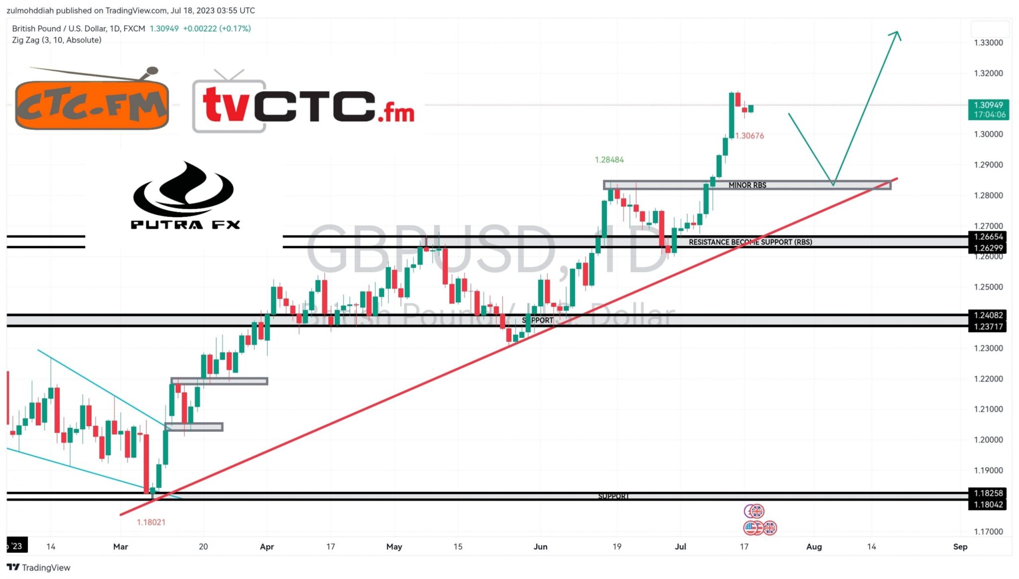 - Harga juga telah berjaya break dan close diatas Resistance semasa dan Minor Resistance. Kini kedua-dua Resistance tersebut telah menjadi Support (RbS).