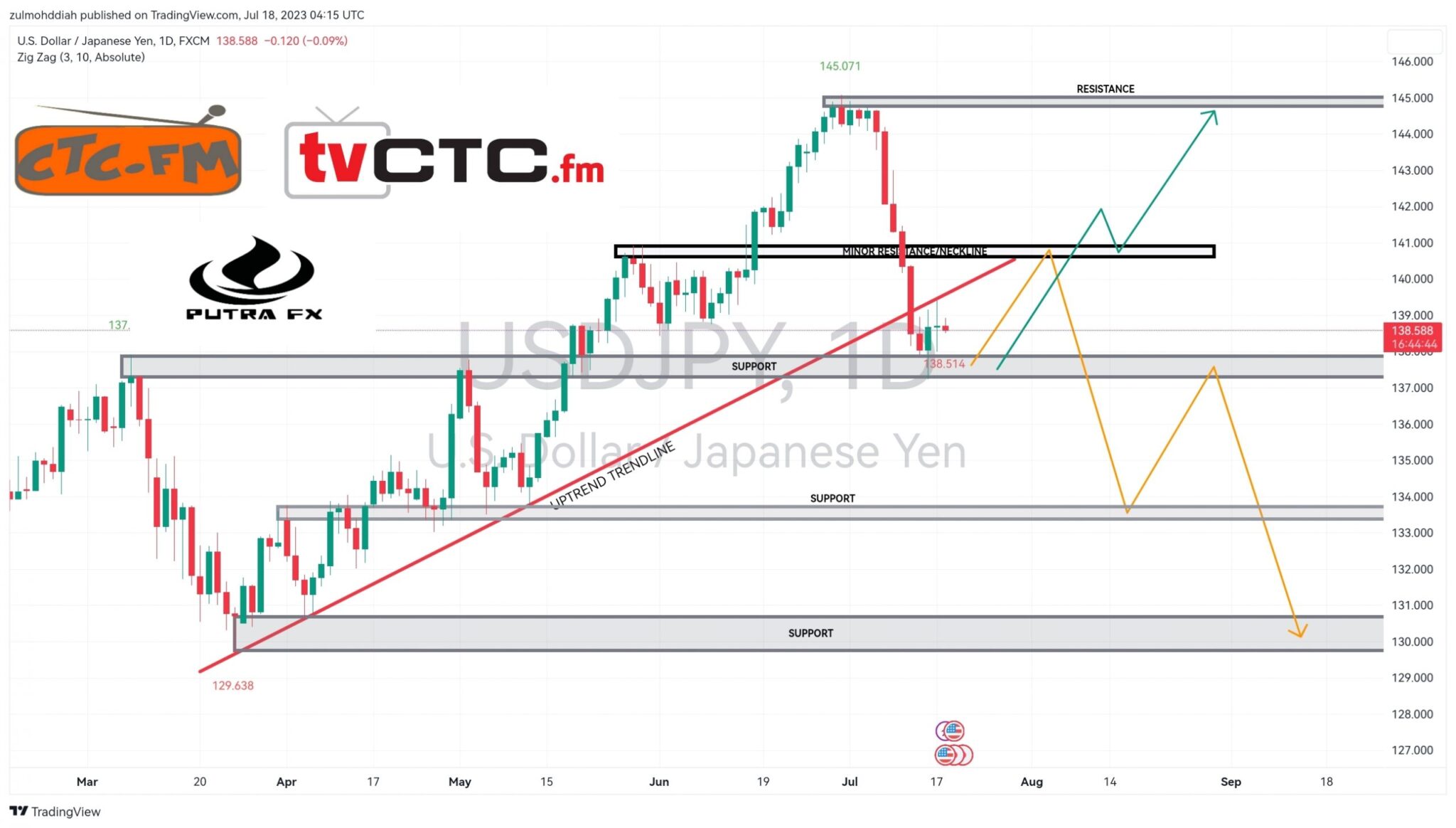 - Ketika ini sepertinya harga telah berjaya break dan close dibawah Uptrend Trendline tersebut, namun saya masih menunggu untuk harga break dan close dibawah Support semasa untuk comformation bahawa harga akan membuat pertukaran trend.