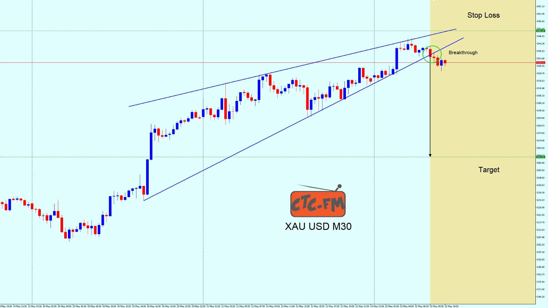 - Stop Loss : Di atas paras swing high terkini iaitu 3,350.259 USD (di atas rintangan wedge)