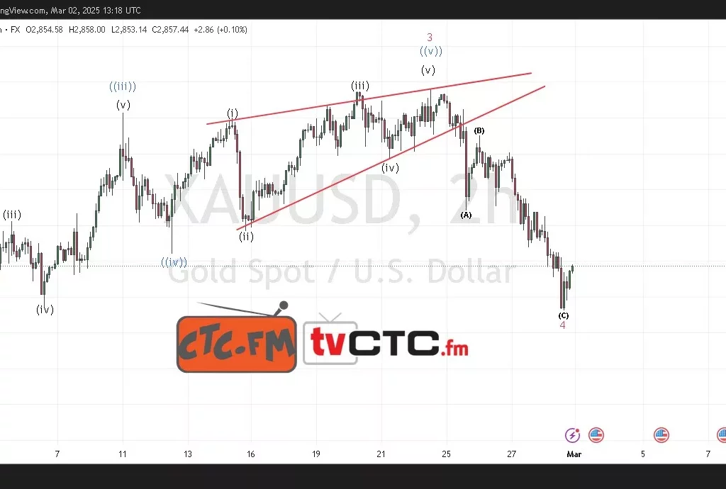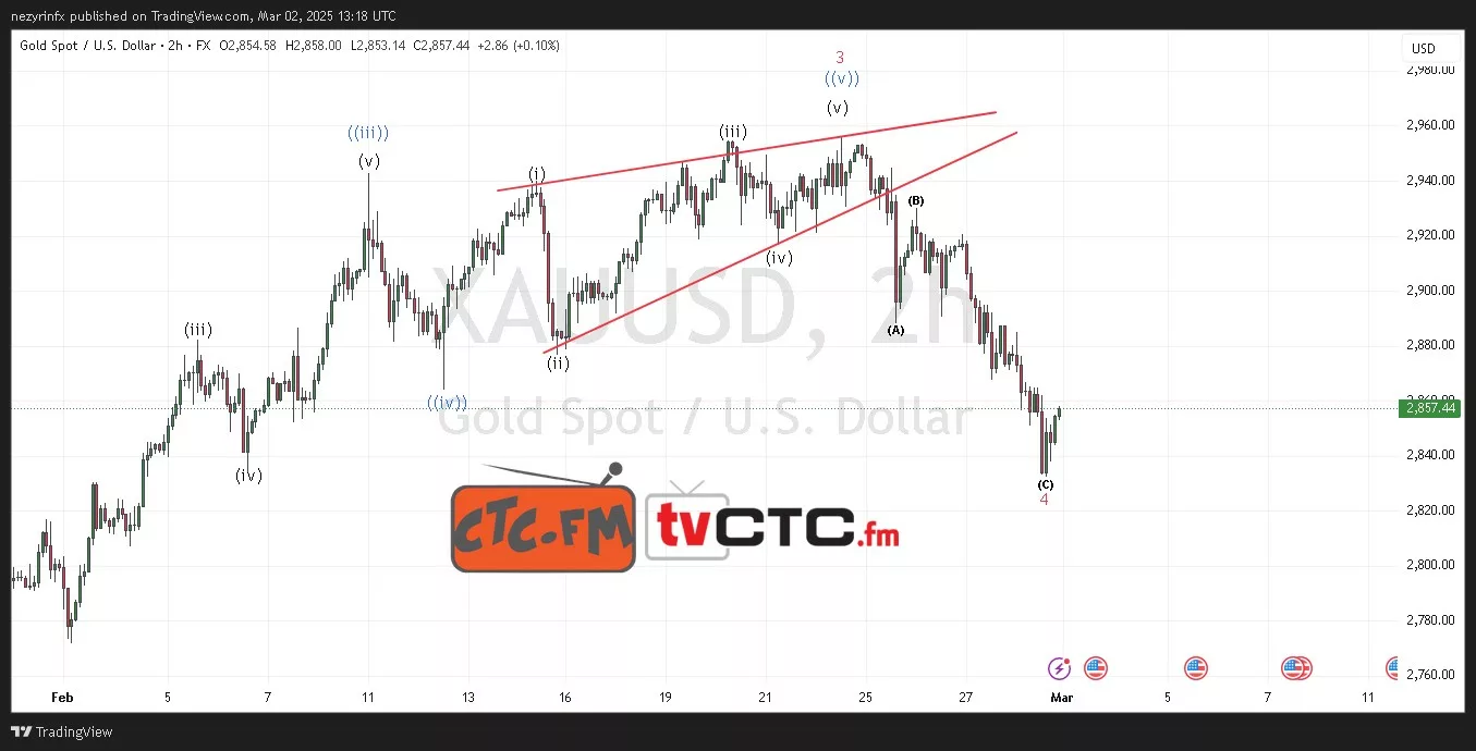 Kemas kini mencadangkan gelombang 3 telah berakhir pada puncak $2956 dan setelah itu dapat dilihat satu 3 gelombang penurunan telah berlaku dan mungkin telah berakhir pada paras rendah $2836 dan kini harga akan menyambung semula pendakian untuk menyelesaikan gelombang 5.