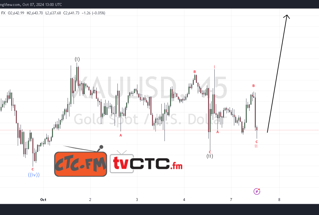 Kemas kini mencadangkan gelombang (ii) berakhir pada paras rendah $2631 dan kemudian harga melakukan satu pendakian untuk menyelesaikan gelombang i of (iii) pada puncak $2670. Ketika ini gelombang ii of (iii) berkemungkinan telah diselesaikan pada paras rendah $2637 dengan struktur dalaman terbentuk sebagai Flat Correction ABC.