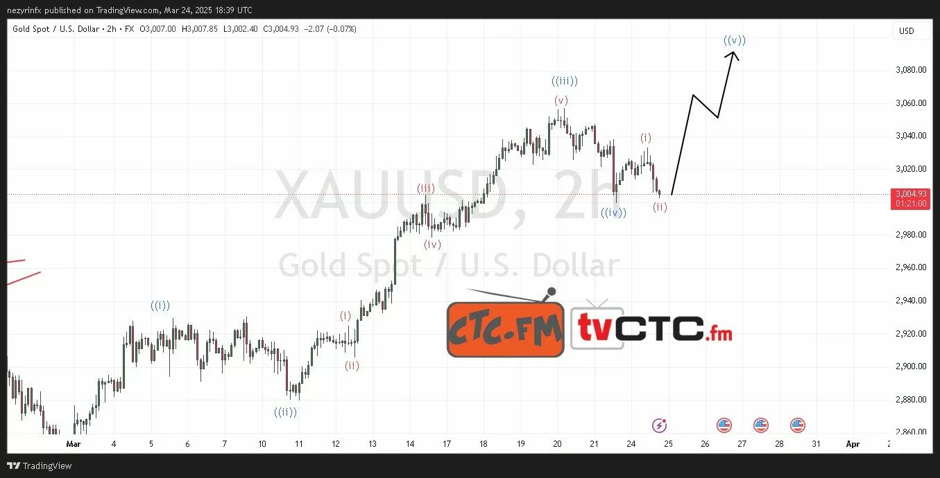 Kemas kini mencadangkan gelombang ((iv)) telah berakir pada paras rendah $2999 dan kini dijangka harga untuk melakukan pendakian didalam 5 gelombang. Pada masa ini gelombang (i) of ((v) berakhir pada puncak $3033 dan manakala gelombang (ii) of ((v)) dicadangkan berakhir pada paras rendah $3002.